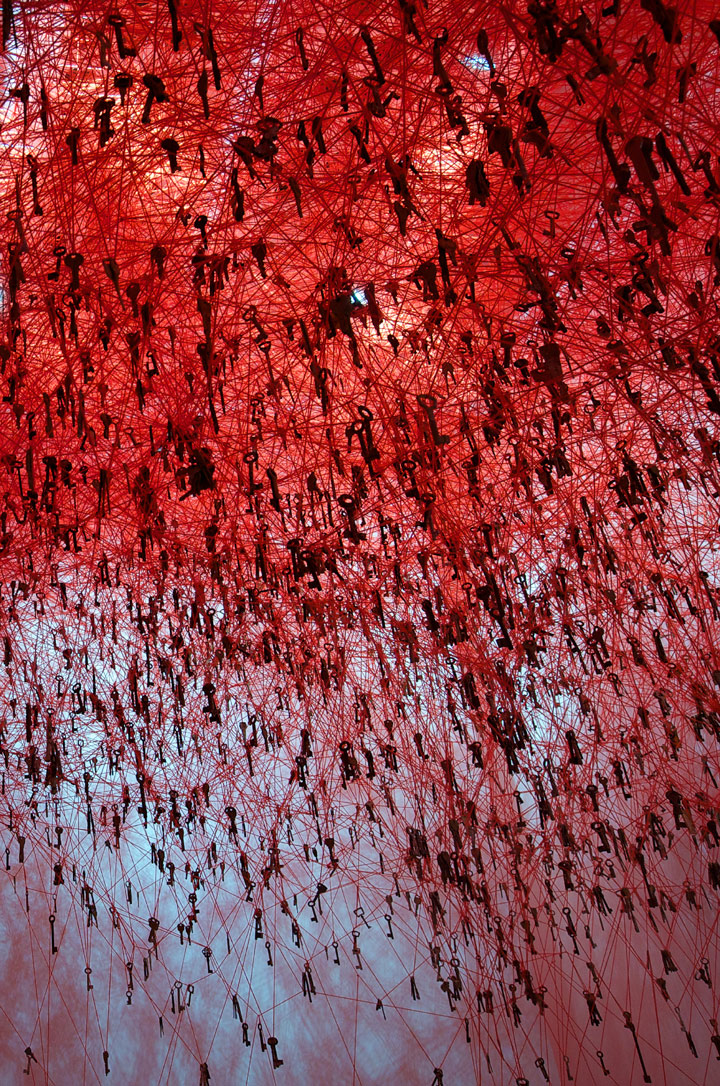 For the 56th Venice Biennale, Shiota unveiled ‘The Key in the Hand' (2015), a piece created for the Japanese pavilion. In this installation, 180,000 keys gathered through an open call were suspended from dense webs of red yarn, which linked the gallery space to two wooden boats on the floor. A photograph of a child holding a key was displayed along-side four monitors featuring videos of young children talking about memories before and after they were born. For the artist, keys are a personal object that simultaneously keeps our space safe on a daily basis and has the potential to unlock doors to new, unknown worlds. The keys dangling from thousands of red strings evoked a sense of intercon-nectedness and expansiveness, allowing viewers to imbue their own memories and associations to the familiar every-day item.